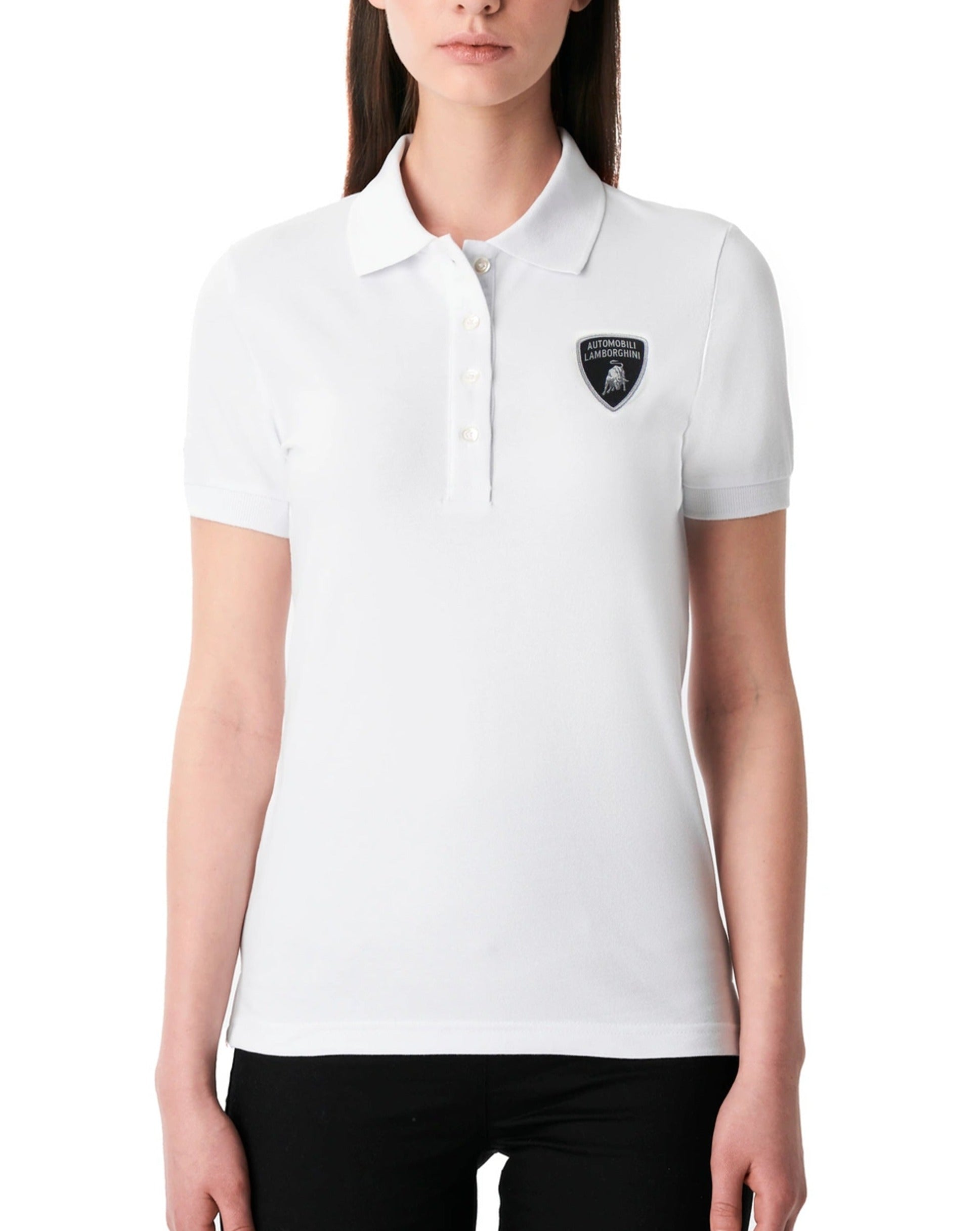 Automobili Lamborghini Women’s Shield Logo Polo Shirt in cotton piqué. Customised with a embroidered logo shield on the chest, a script logo print design and a three-tone detail on the back. Regular fit. Composition: 95% cotton, 5% elastane.