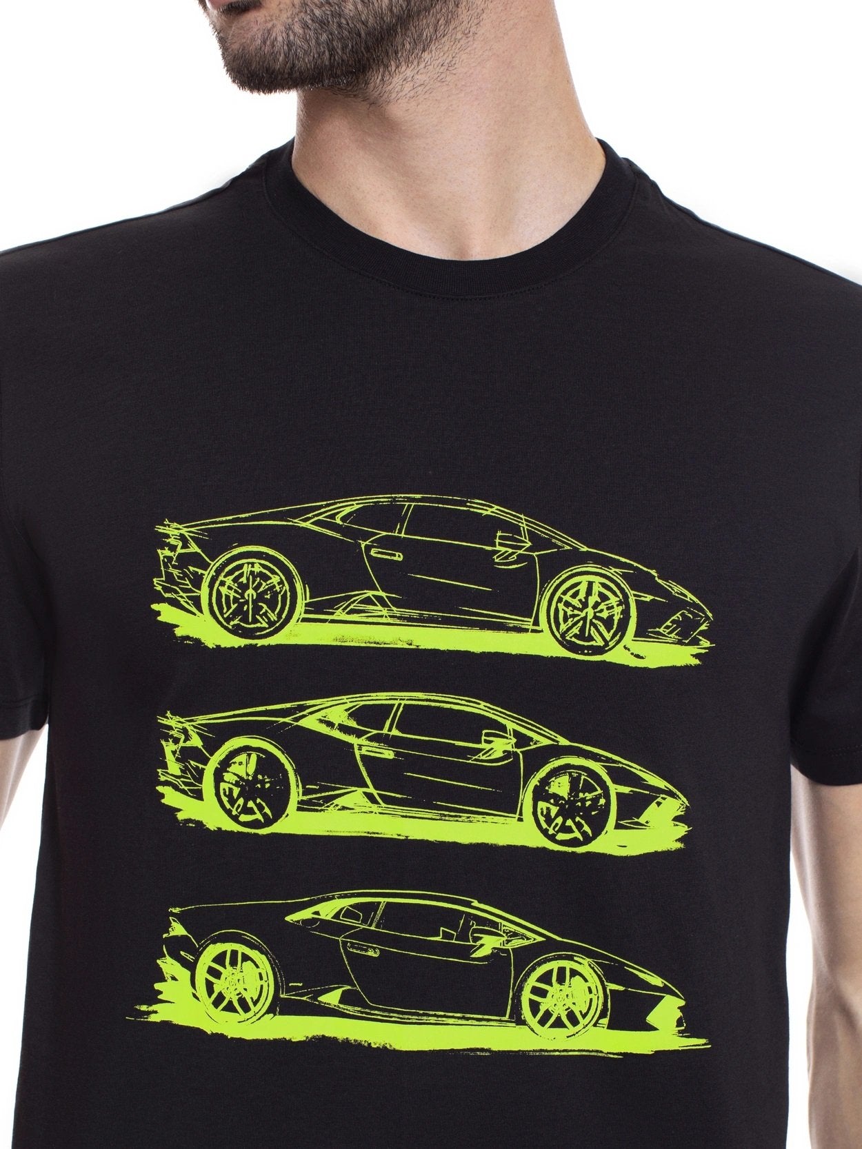 Automobili Lamborghini T-shirt in organic cotton jersey, customised with a chalk-effect Huracán EVO RWD multi-sketch print. The model is 1.87m tall and is wearing a size M Composition: 100% cotton