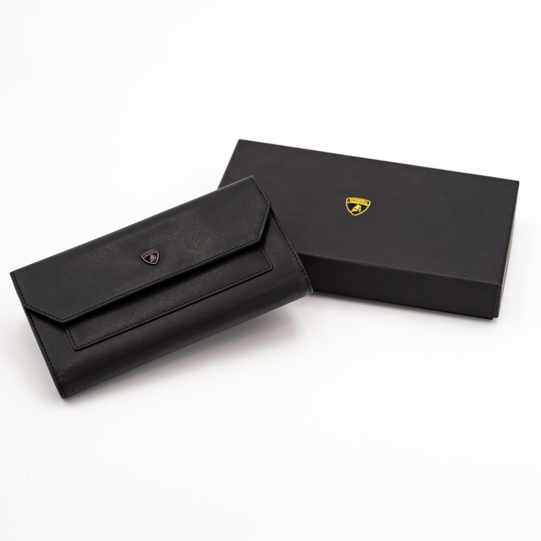 Automobili Lamborghini Women's Classic Leather Wallet - Black This timeless wallet is crafted from luxurious genuine leather with the Lamborghini logo embossed on the front, ensuring a stylish and durable accessory.