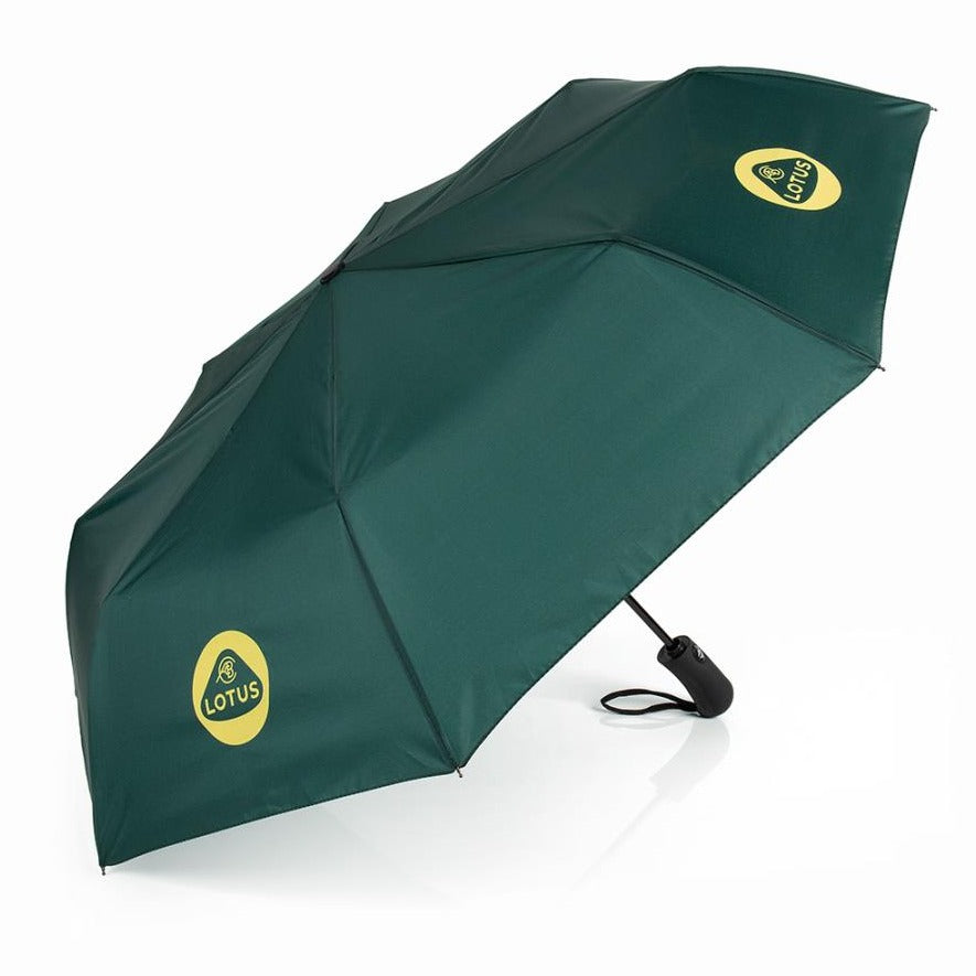 Pocket umbrella styles with green canopy and printed LOTUS roundels, umbrella comes in a mesh carry pouch.
