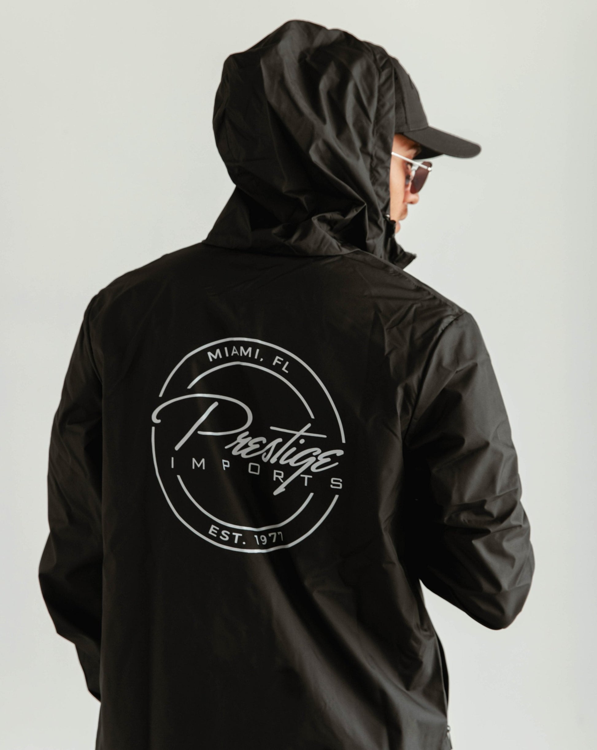 100% Rip-Stop Packable Polyester, Water Resistant, Waterproof Zips along front and side pockets, comes with a custom Prestige Imports Keychain.