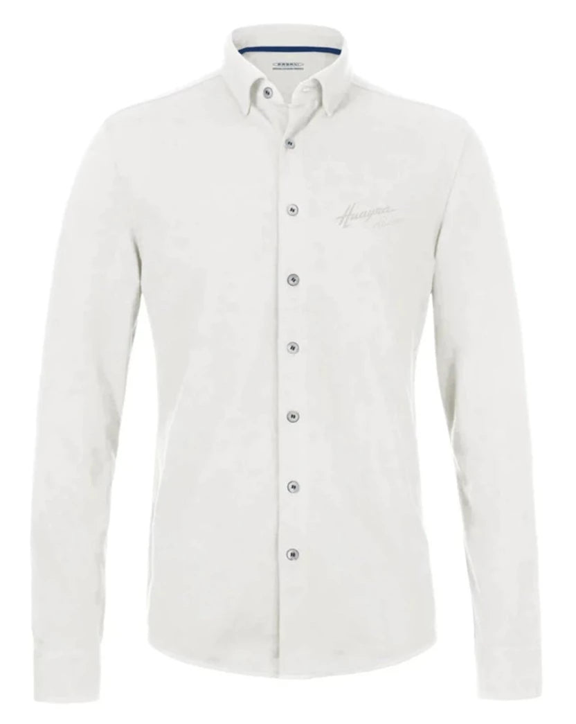 The Pagani Automobili Huayra Roadster Men's Dress Shirt is crafted from high-quality fabric and features customized buttons, contrasting stitchings, and embroidered tone-on-tone logos on the heart and back collar with metallic coating, allowing for subtle, sophisticated elegance.