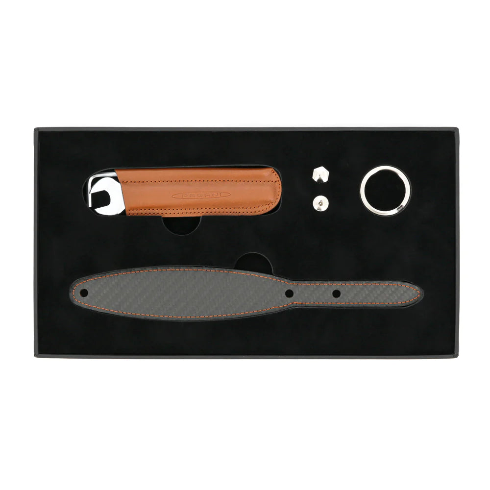 The collection in collaboration with Aznom was created with the aim of reproducing the quality, design and emotion that belong to the Pagani super sports cars in these products. This key ring is made of calfskin and soft carbon fiber. It comes in an assembly kit that includes the carbon fiber and leather band, the milled brass screw with nickel finish, brisè ring in two sizes, key and socket head screw in a leather case. The kit is contained in a box with dedicated compartments and assembly instructions.