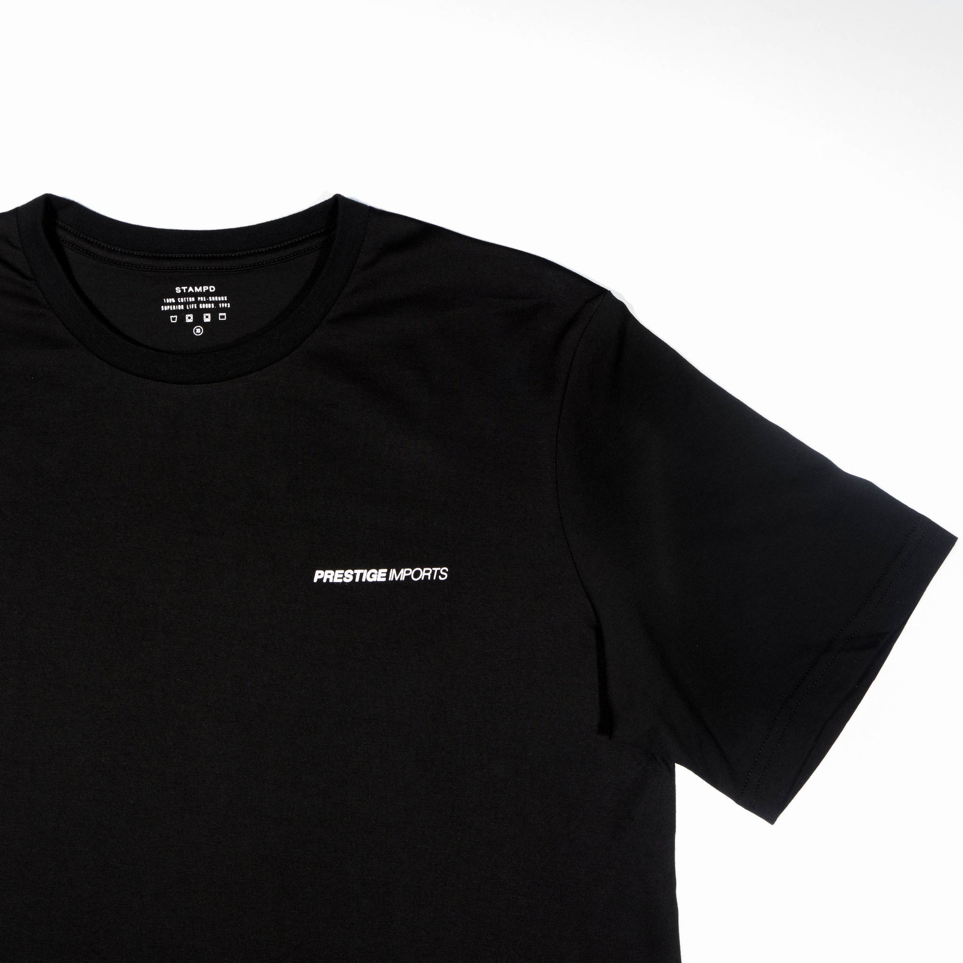 Black t-shirt with Original Prestige Imports logo art printed on the front.